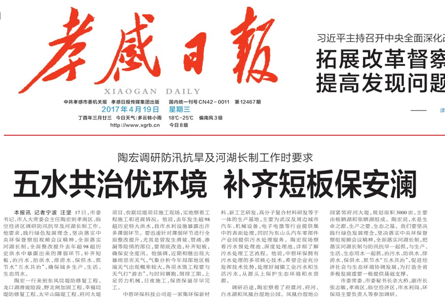 17日,市委書記、市人大常委會主任陶宏到孝南區(qū)、臨空經(jīng)濟區(qū)調(diào)研防汛抗旱及河湖長制工作。他要求,踐行綠色發(fā)展理念,堅決落實中央環(huán)保督察組視頻會議精神,全面落實河湖長制,全面整改提升去年超98超歷史洪水中暴露出來的薄弱環(huán)節(jié),補齊短板,治污水、防洪水、排澇水、保供水、抓節(jié)水“五水共治”,確保城鄉(xiāng)生產(chǎn)、生活、生態(tài)用水。