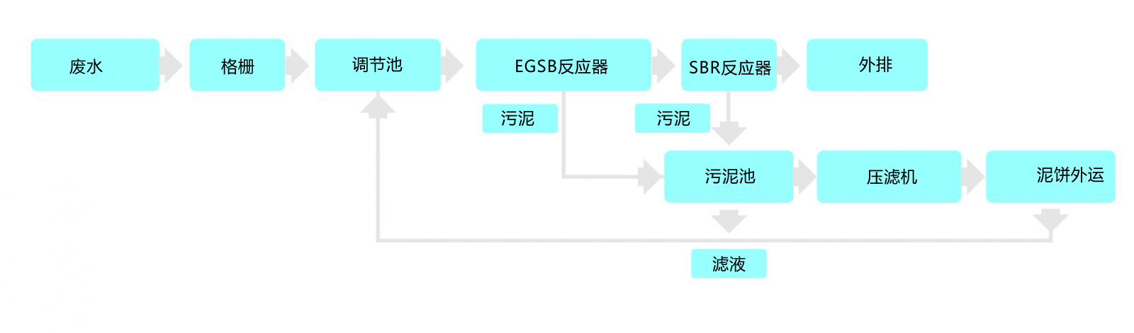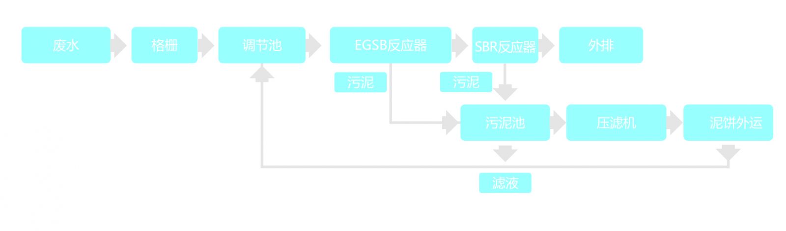 EGSB與SBR反應(yīng)器所產(chǎn)生的污泥收集到污泥池,經(jīng)過壓濾機(jī)處理成濾餅后外運(yùn),所產(chǎn)濾液回流至調(diào)節(jié)池。