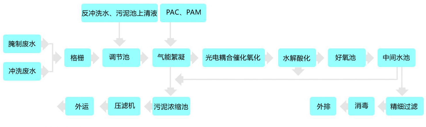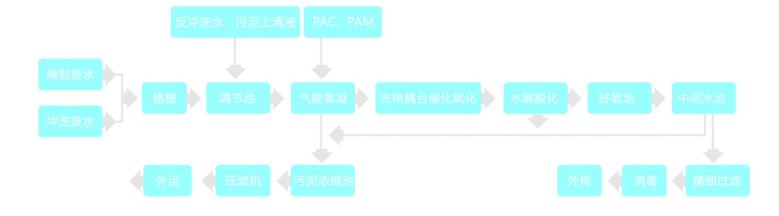 蔬菜腌制及車間沖洗廢水首先進入格柵截留廢水中大的雜物后與各系統(tǒng)反沖洗水、污泥濃縮池的上清液匯合后進入調(diào)節(jié)池,進行水量和水質(zhì)調(diào)節(jié),并通過厭氧作用去除部分COD后進入氣能絮凝系統(tǒng),通過投加絮凝劑進一步去除污水中絕大部分懸浮態(tài)的無機及有機雜質(zhì),出水進入光電耦合催化氧化反應(yīng)器,通過電解降低廢水中所含的高鹽成分,提高活性極強的羥基自由基的產(chǎn)率,通過加成、取代、電子轉(zhuǎn)移等反應(yīng),將廢水中大部分有機污染物轉(zhuǎn)化為簡單無機物。出水經(jīng)過水解酸化后進入好氧池,進一步去除COD、氨氮等各類污染物,再經(jīng)多級精細(xì)過濾、消毒后達(dá)標(biāo)排放。