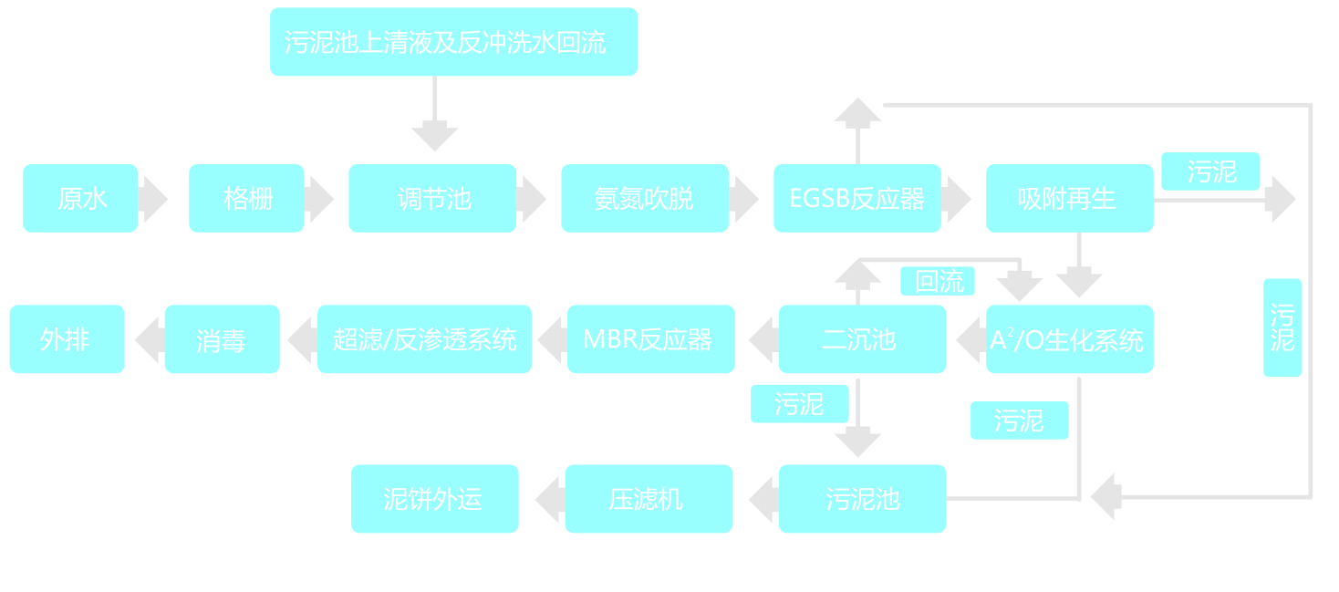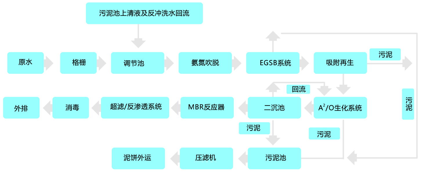 EGSB反應(yīng)器、吸附再生池及二沉池產(chǎn)生的剩余污泥收集于污泥池,濃縮并經(jīng)壓濾機(jī)脫水后外運(yùn)。