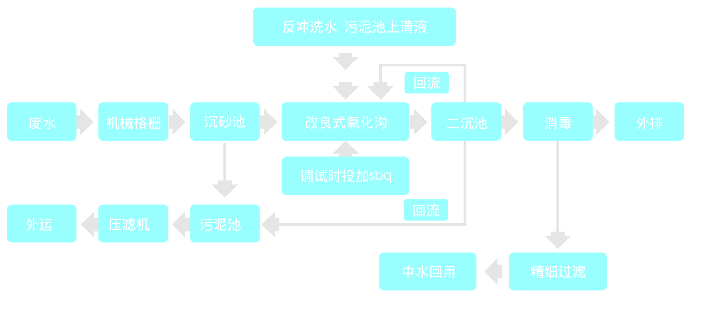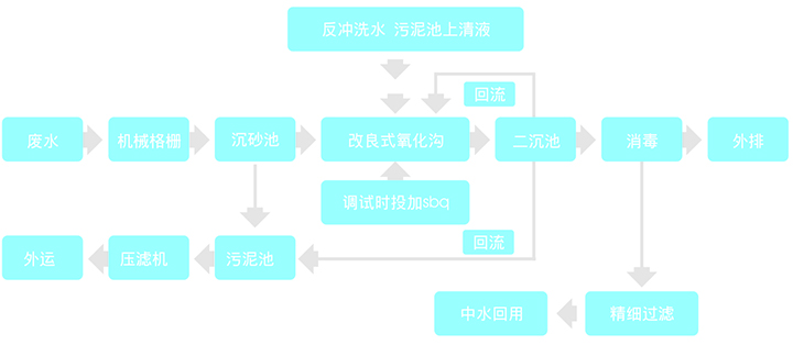 廢水經(jīng)機(jī)械格柵截留大塊飄浮物后進(jìn)入沉砂池,去除較大無機(jī)顆粒物。出水以兩點(diǎn)進(jìn)水的方式進(jìn)入改良式氧化溝,通過控制三點(diǎn)污泥回流的分配比來調(diào)整不同反應(yīng)區(qū)的C/N、C/P之比,并利用專有SBQ菌高效去除COD及脫氮除磷,出水進(jìn)入二沉池進(jìn)行泥水分離,上清液經(jīng)消毒后達(dá)標(biāo)外排,或經(jīng)精細(xì)過濾后作為中水回用。