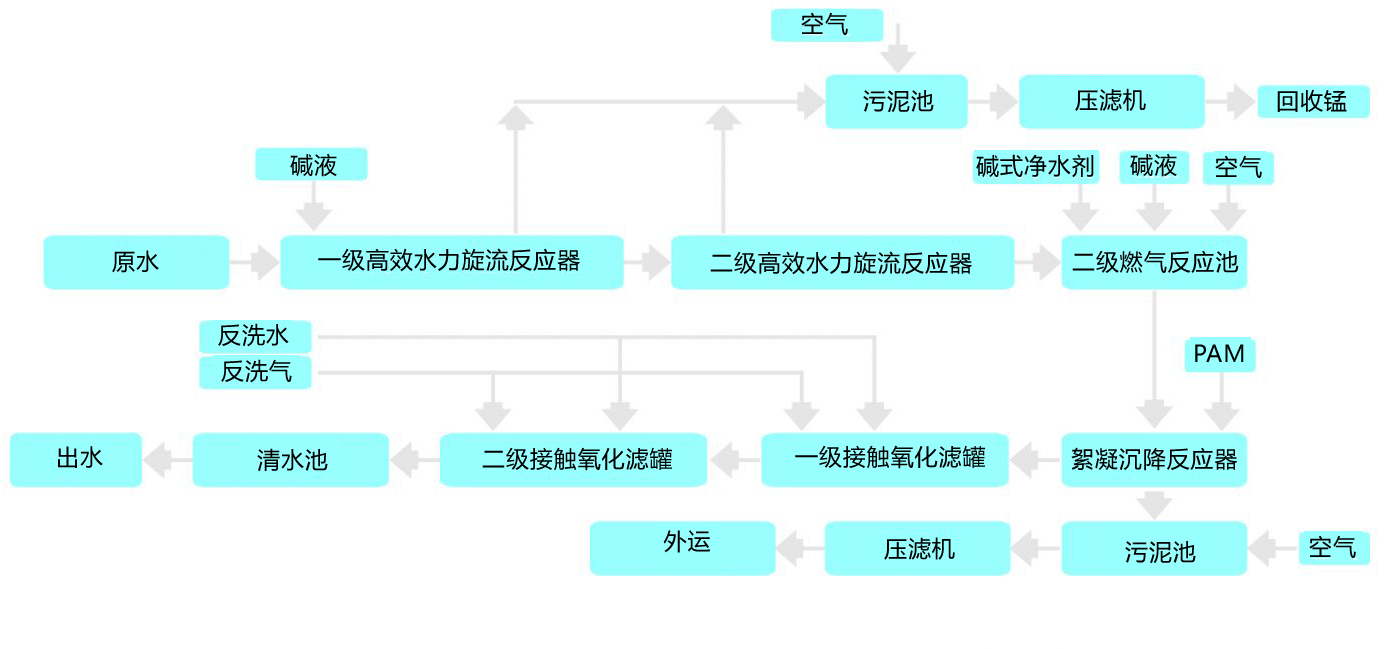 原水進入兩級高效水力旋流反應器,在進水管道前投加藥劑調(diào)節(jié)PH值,在反應器內(nèi)形成初級懸浮態(tài)水合錳氧化物,并在錐形分離區(qū)初步實現(xiàn)固液分離,上清液進一步調(diào)節(jié)pH,充分曝氣后,水中殘余的錳離子轉化成水合MnO2及Mn(OH)2,在絮凝沉降反應系統(tǒng)內(nèi)再次固液分離。出水經(jīng)二級“活性濾膜”自催化系統(tǒng)精細過濾,達到設計標準(錳≤2mg/L、鐵≤1mg/L)。