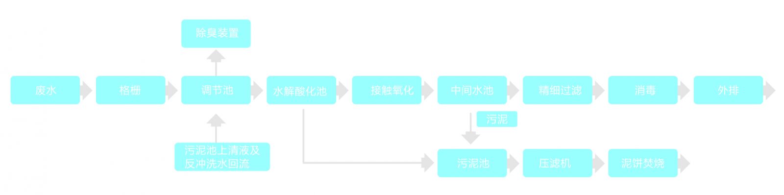 水解酸化池、中間水池內(nèi)的污泥排入污泥池,通過壓濾機脫水后的泥餅經(jīng)鍋爐焚燒(主要是殺滅污泥中含有的病菌、病毒、寄生蟲卵),或在泥餅中摻入石灰、植物秸桿攪拌均勻,堆放熟化滅菌,3個月后外運或填埋。