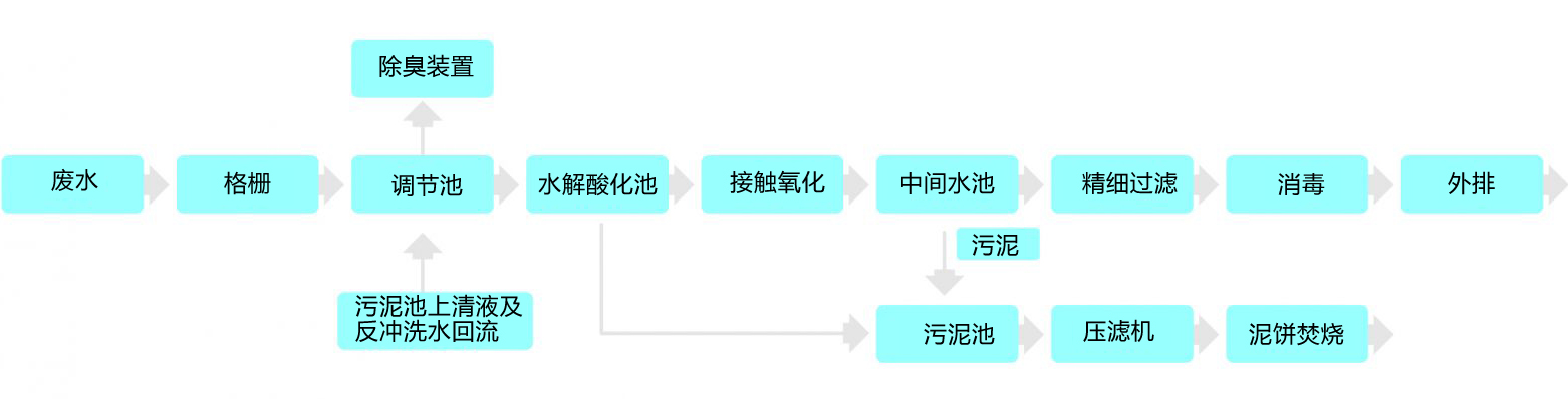 來自化糞池的污水經(jīng)機械格柵去除大的浮渣后,進(jìn)入調(diào)節(jié)池均勻水質(zhì)、水量。調(diào)節(jié)池內(nèi)的廢氣經(jīng)生物除臭裝置處理后外排。出水進(jìn)入水解酸化池,將大分子有機物轉(zhuǎn)化為小分子物質(zhì),降低COD負(fù)荷。接著進(jìn)入接觸氧化池,污水中的有機污染物可被負(fù)載在填料上的生物膜高效降解,其出水經(jīng)由中間水池固液分離,上清液經(jīng)二級精細(xì)過濾、消毒后達(dá)標(biāo)外排。
